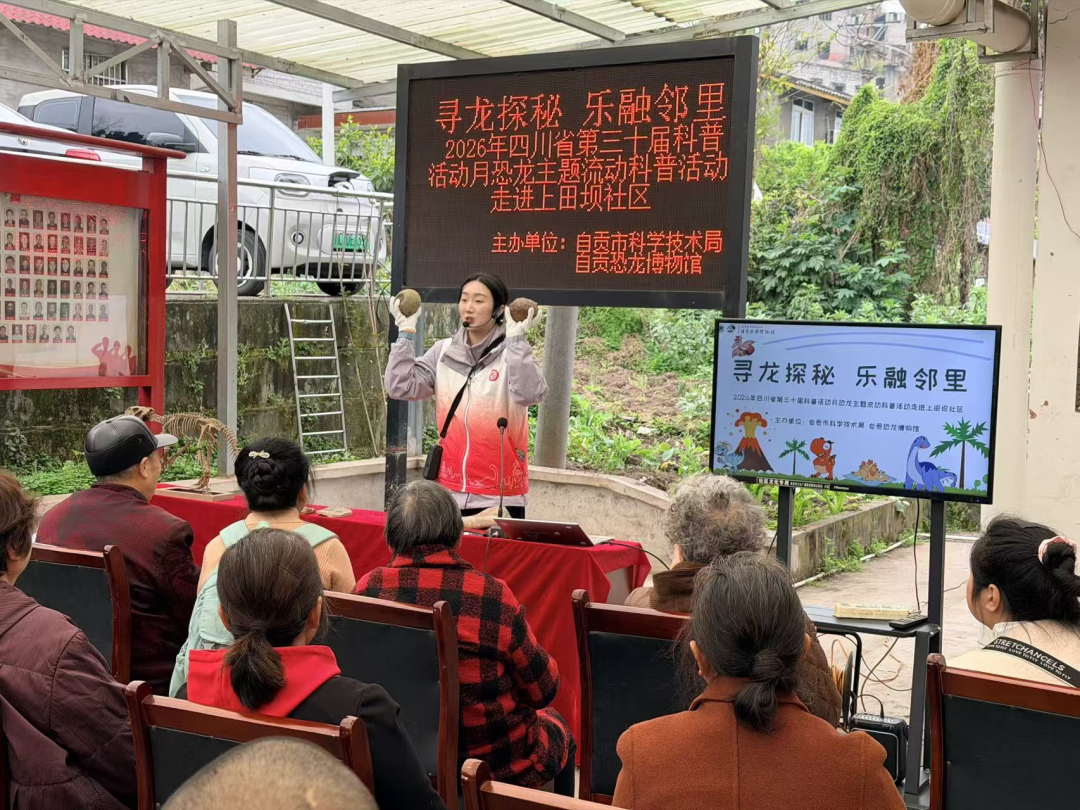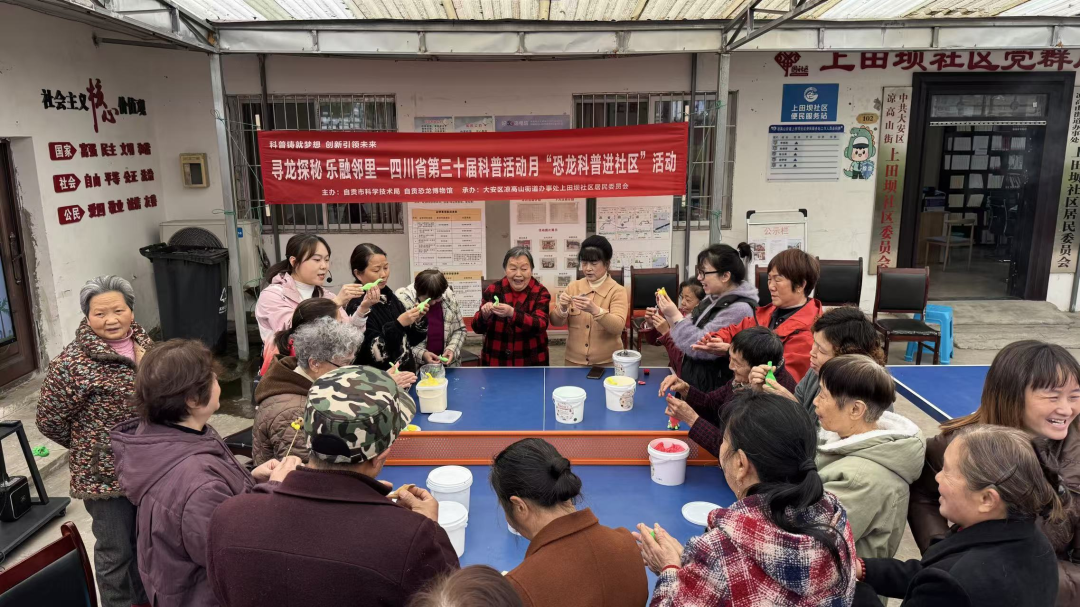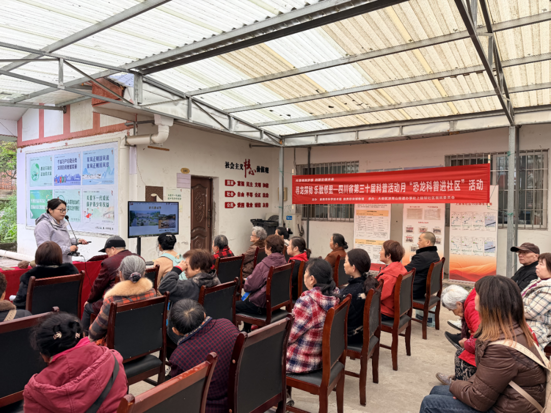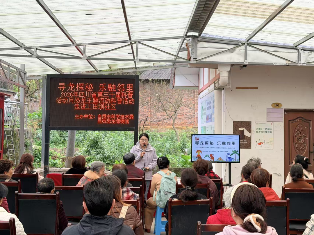 充满发现与惊喜的科普之旅吧!古生物科普进社区,点亮科学新生活。3月17日,由自贡市科学技术局、自贡恐龙博物馆主办,大安区凉高山街道上田坝社区承办的四川省第三十届科普活动月“寻龙探秘 乐融邻里”恐龙主题流动科普进社区活动顺利开展。50余名社区居民齐聚一堂,在家门口开启了一场趣味十足的侏罗纪探秘之旅。
