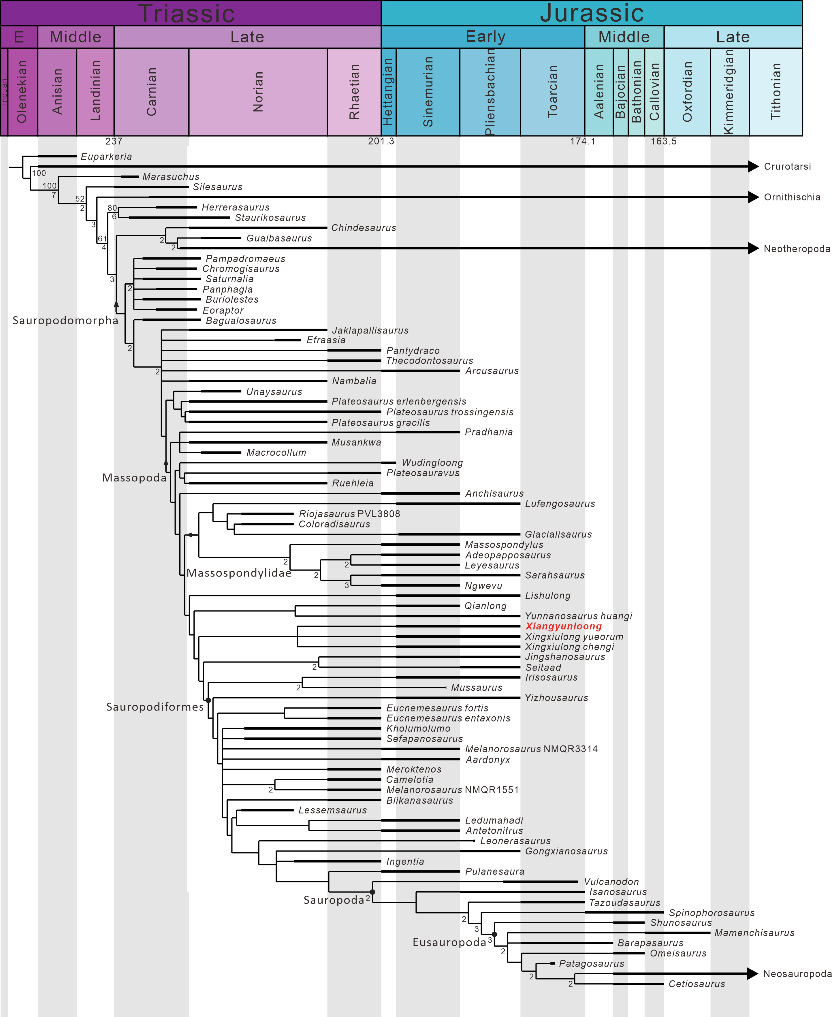 研究表明,祥云龙的体型较大,体长可达9-10米,是我国目前发现的体型最大的早期分化蜥脚型类恐龙之一。祥云龙在骨骼形态学上与目前已知的其他早期分化蜥脚型类恐龙都具有明显区别,系统发育分析显示其与云南禄丰之前发现的星宿龙属关系较近,属于非蜥脚类大足龙类(图4)。祥云龙背椎的下椎弓突高、尾椎发育隔板结构,这些特征都相对较“进步”,可能与其体型增大有关。同时,与我国之前发现的同体型的早期分化蜥脚型类相比,祥云龙的颈椎较短、尾椎长而粗壮、人字骨较长、髂骨的髋臼脊较短,显示它应是一种脖子短、尾巴长的恐龙,更有可能是两足行走,其强大的尾部能够有效平衡身体前部的重量,从而可能帮助这种短颈恐龙更稳定地抬起前身,弥补了颈部长度上的限制。祥云龙很可能代表了一种在早期分化蜥脚型类恐龙演化中的形态适应类型:不是追随“加长颈部”的主流趋势,而是把强化与延长尾部作为演化的“重点”。凤鸣祥云龙的发现,进一步深化了我们对我国西南地区早侏罗世蜥脚型类恐龙的地理分布、多样性和演化的认识。