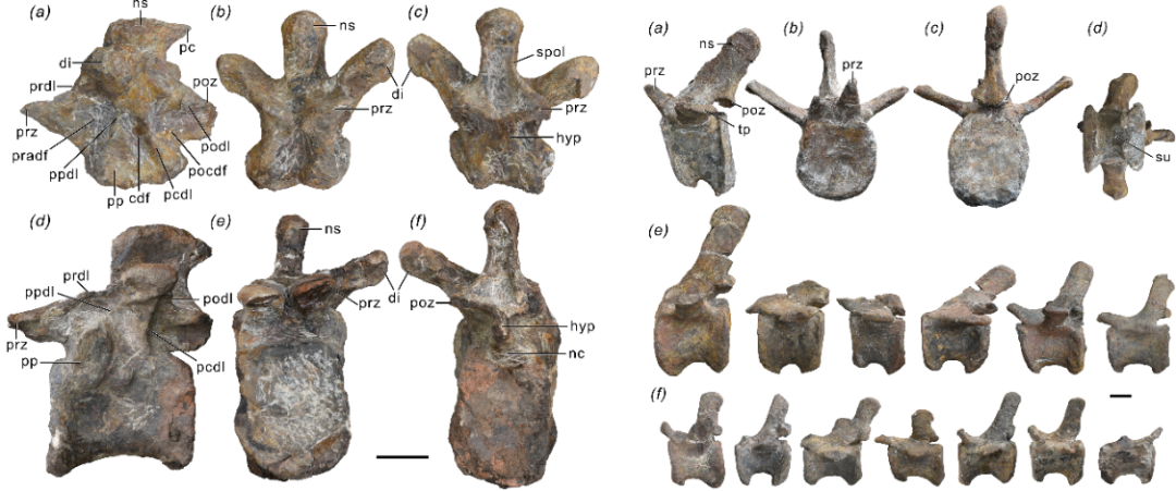 图3 祥云龙的后部背椎(左)和尾椎(右),比例尺为10厘米