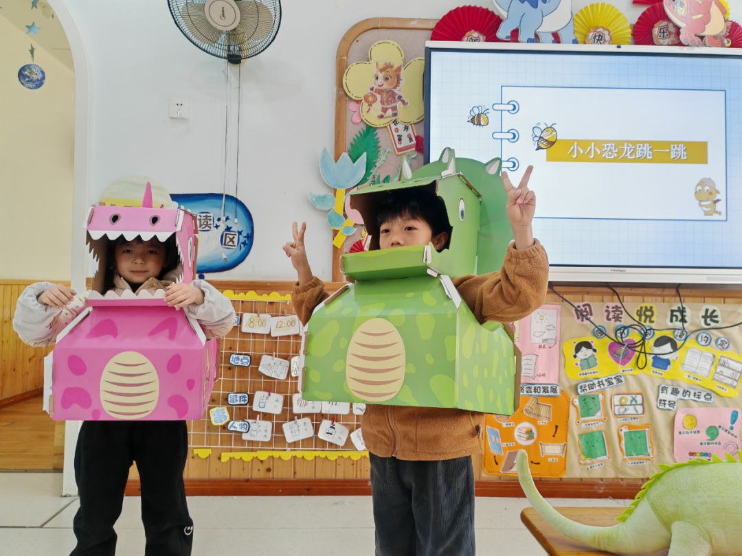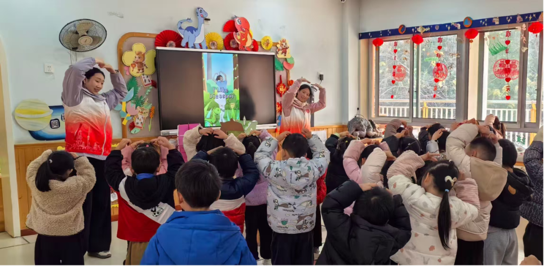 孩子们跟随着音乐节奏欢快舞动,化身一只只活泼的“小恐龙”,在跳跃与欢笑中,拉近了与史前世界的距离。