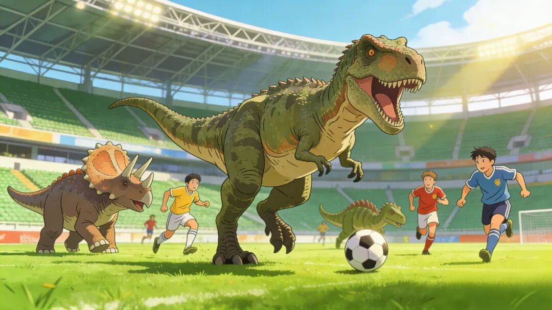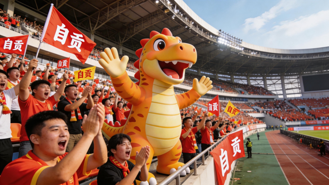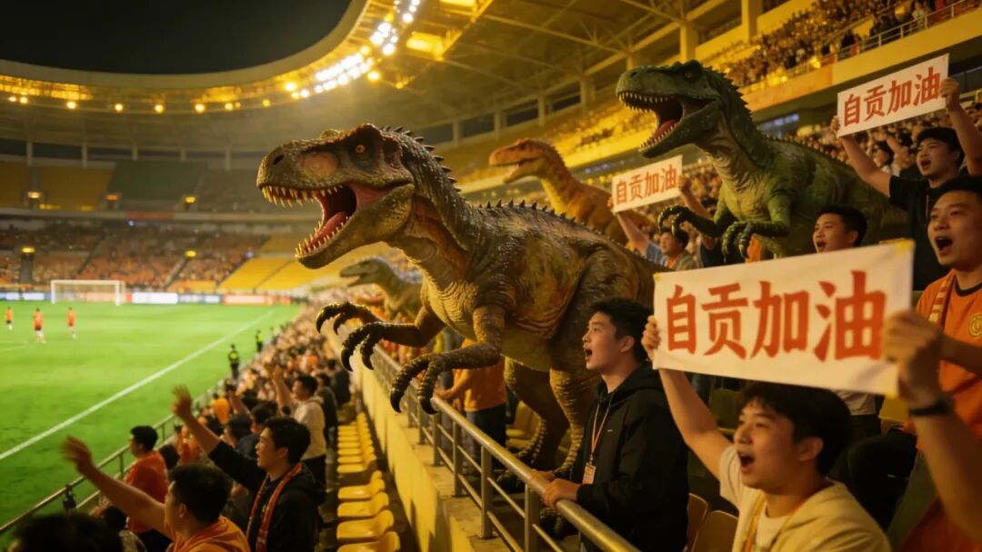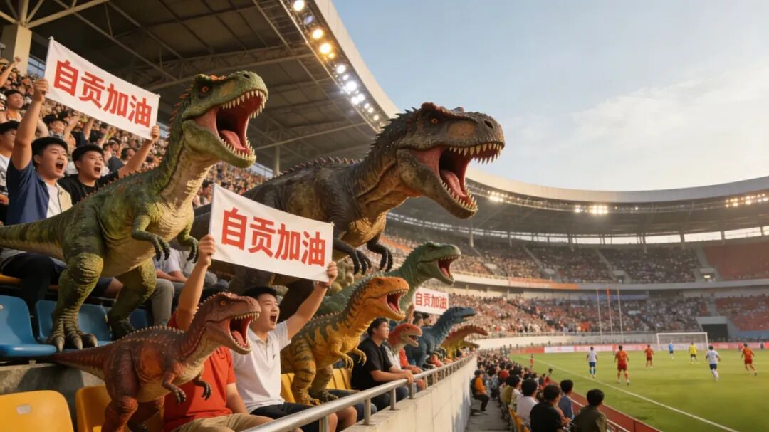 AI创意p图:在你的想象中,恐龙如何为“自贡灯城燊龙队”加油助威?是站在自贡南湖体育场看台上加油呐喊?还是和球员们一起在球场肆意奔跑?还是有什么另外独特的加油方式呢?快发挥你的想象AI一下~